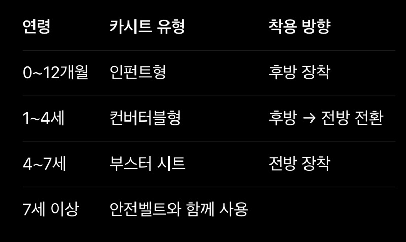 아이의 연령과 체중에 따라 적절한 카시트를 선택하는 것이 가장 중요합니다.